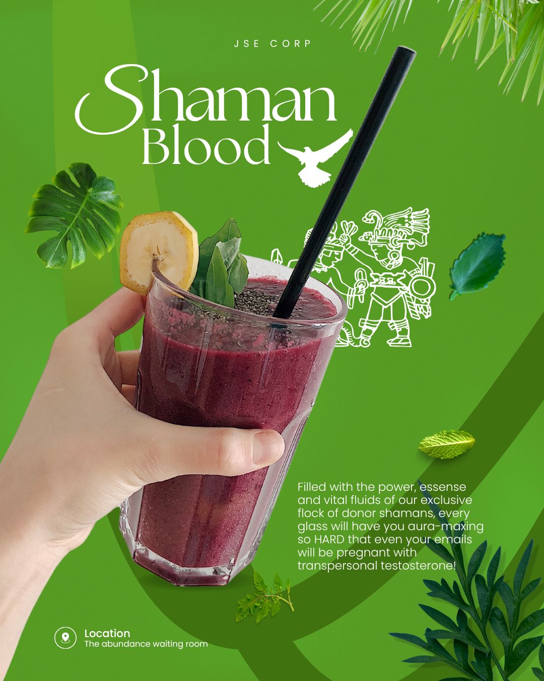 You need our all-new Shaman Blood chilled beverage-like product. Packed with a selection of shamanic bodily fluids, Açaí berries, and secret plant helpers, this recreational liquid provides an instant boost to iron levels, plus the insatiable urge to construct a pyramid in honour of Quetzalcoatl.